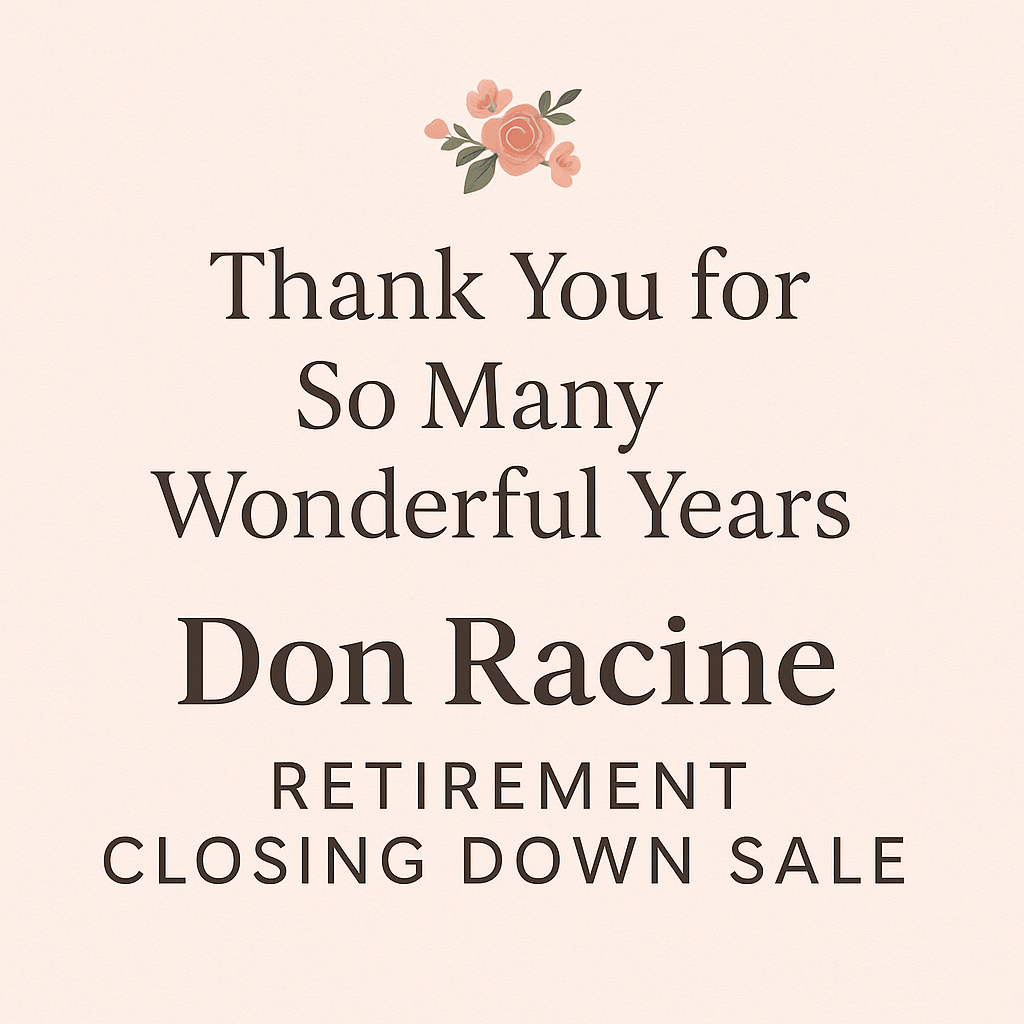 🌸 A Fond Farewell from Don Racine 🌸After a lifetime in fashion, the time has come for us to hang up our boutique rails and step into retirement.Don Racine has been more than just a ladies boutique , it’s been part of the community, a place where we’ve shared laughter, conversations, and countless moments helping women feel stylish and confident. Over the years, we’ve had the privilege of meeting incredible customers, many of whom became friends.We want to take this opportunity to say a heartfelt thank you to everyone who supported us throughout this journey. Your loyalty and kindness have meant more than words can say.As we say goodbye, we’re holding a Retirement Closing Down Sale. Everything must go – beautiful pieces at once in a lifetime prices. This is your last chance to take home something special from Don Racine before we close our doors for good.From our family to yours: thank you for the memories, the support, and for allowing us to be part of your lives.With love and gratitude,The Parsons Family and Staff 💖